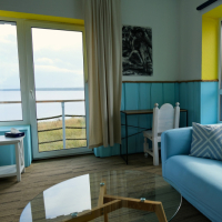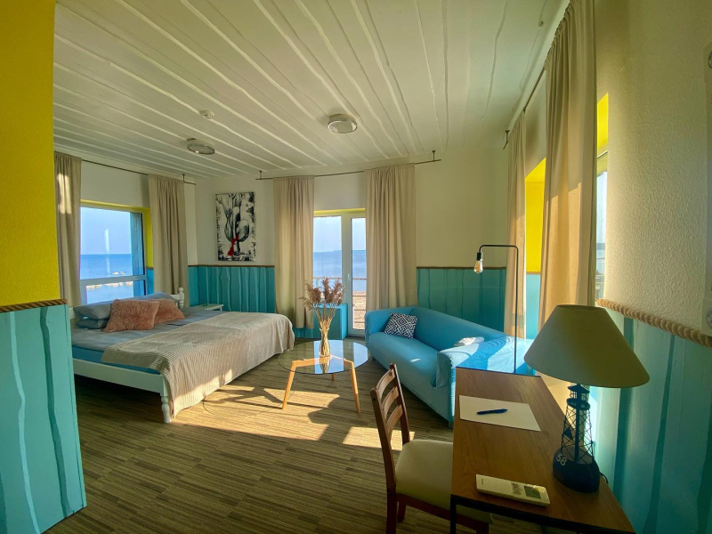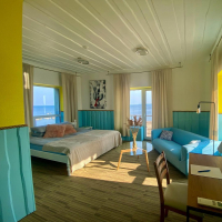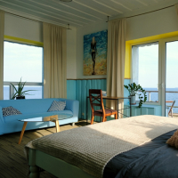 All rooms offer sea views and have private bathrooms with showers. Paintings by local artists add a touch of charm and personality to each room.